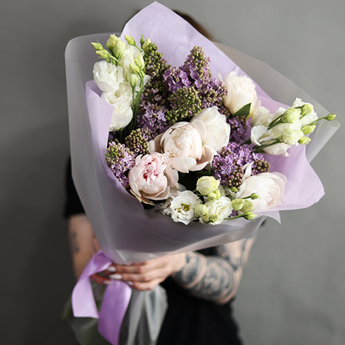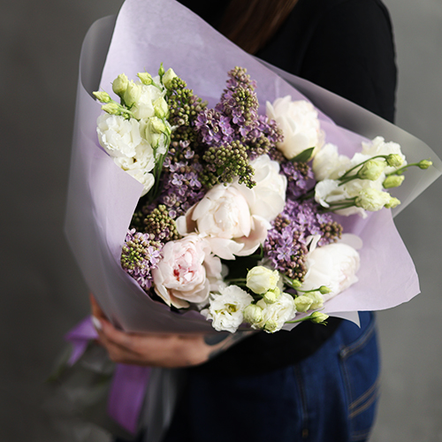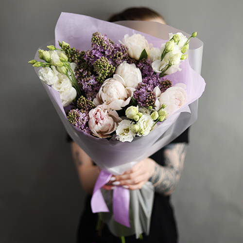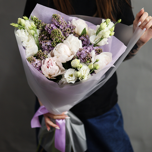 Букет "Сиреневый сад" из ароматной сирени, пионов и эустом
